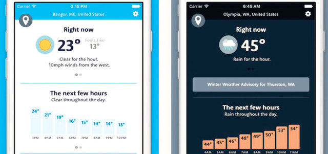 يتيح تطبيق Hello Weather المتوافر لمستخدمي أجهزة «آي فون» عبر متجر «آب ستور»، إمكانية الحصول على معلومات الطقس التي يحتاجون إليها، دون عرض تفاصيل غير مهمة، إذ إنه يحتوي على ثلاثة أقسام هي: «الطقس الآن»، و«الطقس خلال الساعات المقبلة»، و«الطقس هذا الأسبوع».