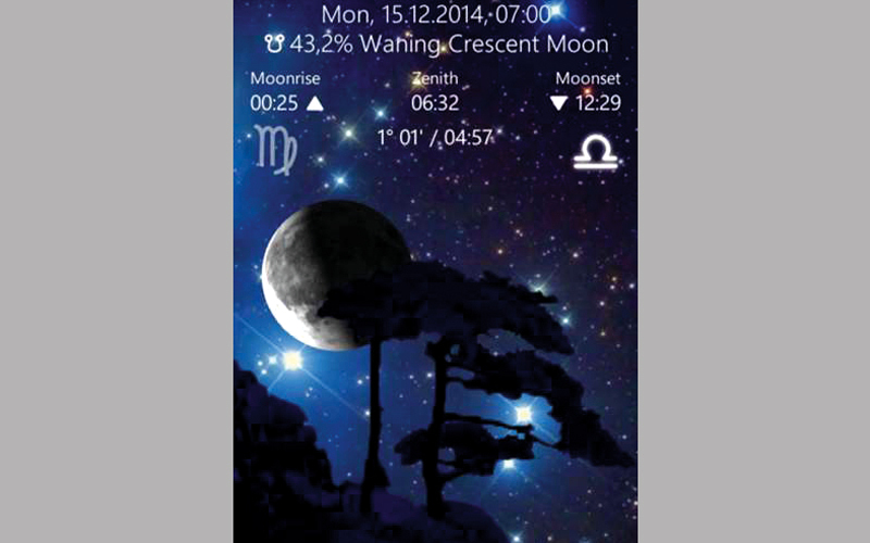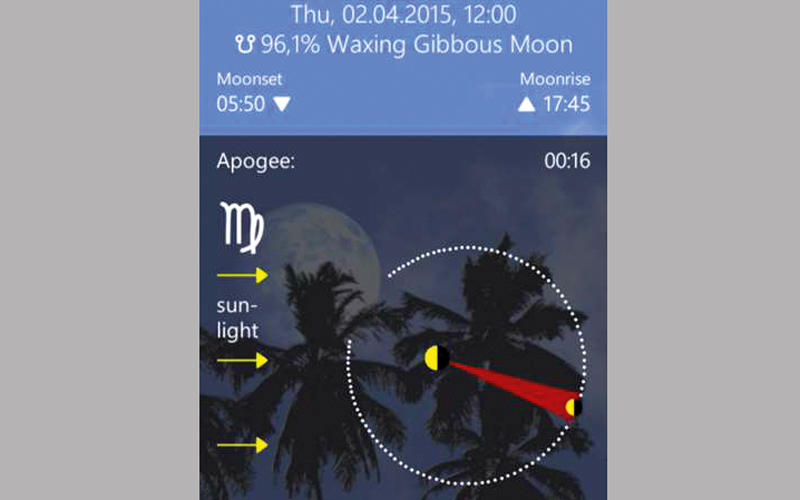 ويقدم تحديثات مباشرة على الشاشة الرئيسة للجهاز، كما يشتمل على تقويم بمراحل تطور القمر. ويتيح لمستخدمه إنشاء تذكير بالمراحل المميزة، كتحوله إلى بدر أو بزوغ الهلال الجديد.