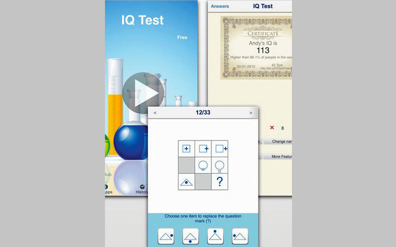 ينتمي تطبيق IQ Test FREE إلى متجر «آب ستور»، ويندرج تحت فئة «الخدمات» Utilities. ويتيح التطبيق لمستخدمه قياس مستوى ذكائه (IQ)، ويعطي المستخدم نتائج دقيقة عن هذا المستوى. كما يعرض التطبيق للمستخدم سلسلة من الاختبارات التي أعدها مجموعة من الخبراء والمختصين، وبعد أن يستكمل المستخدم الاختبارات يتلقى شهادة بمستوى ذكائه وترتيبه العالمي.