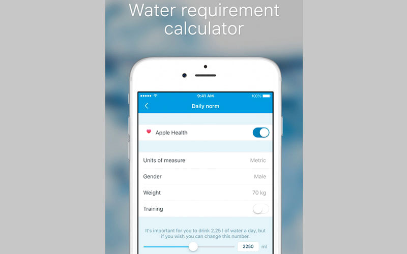 ويحتوي التطبيق على ملمح تنبيه المستخدم إلى تناول جرعات الماء، ويتكامل مع تطبيق الصحة الخاص بـ«أبل» للحصول على المعلومات الخاصة بقياسات المستخدم الحيوية وحساب جرعات المياه التي يحتاج إليها جسمه بناء على ذلك.