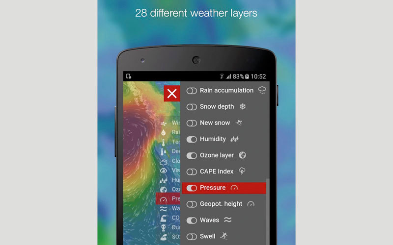 يقدم التطبيق كذلك توقعات تفصيلية للطقس في أي موقع، في ما يتعلق بدرجات الحرارة، وسرعة الرياح، وشدتها، والضغط الجوي، والرطوبة، والمطر، وتراكم الثلوج.