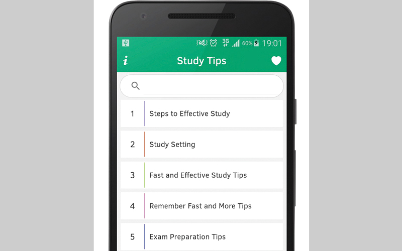 ويقسم التطبيق النصائح الخاصة بالاستذكار إلى 20 فئة، منها: النصائح التي تمكّن المستخدم من الاستفادة بشكل أكثر فعالية من جلسات المذاكرة المعتادة، ونصائح للاستذكار السريع، وأخرى خاصة بتقوية الذاكرة وملكة الحفظ. كما يقدم التطبيق نصائح خاصة بالاستعداد للاختبار، وأخرى خاصة بيوم الاختبار نفسه.