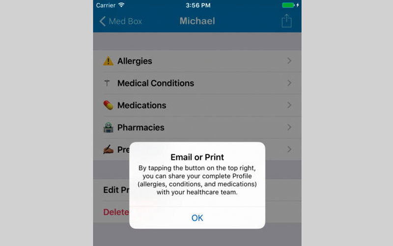 ويقدم التطبيق أيضاً ملمح صندوق الدواء الذي يعمل كمنظم للأدوية، ويذكر المستخدم بمواعيد تعاطيها، وينبهه في حالة التحسس لأيٍّ من مكوناتها. ويسمح ملمح الدردشة للمستخدمين بالتواصل معاً ومناقشة القضايا الخاصة بالتداوي، ويتضمن التطبيق ما يعرف باختبارات الأدوية لمراجعة المعلومات الخاصة بالدواء.