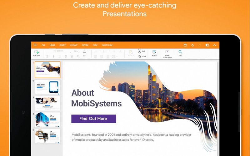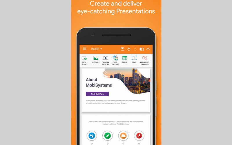 ويسمح بتخزين الملفات في الخدمات السحابية كـ«دروب بوكس»، و«غوغل درايف»، و«وندرايف»، و«أمازون كلاود درايف»، كما يتيح مشاركة الملفات عبر البريد الإلكتروني وشبكة البلوتوث، ويسمح بالاختيار من بين عدد كبير من المظاهر لإنشاء العروض التقديمية وتعديلها عبر أكثر من جهاز. ويستطيع التطبيق فتح ملفات عدة معاً بشكل متزامن، كما يسمح بالعمل على وثيقتين بالتزامن باستخدام وضع اقتسام الشاشة.