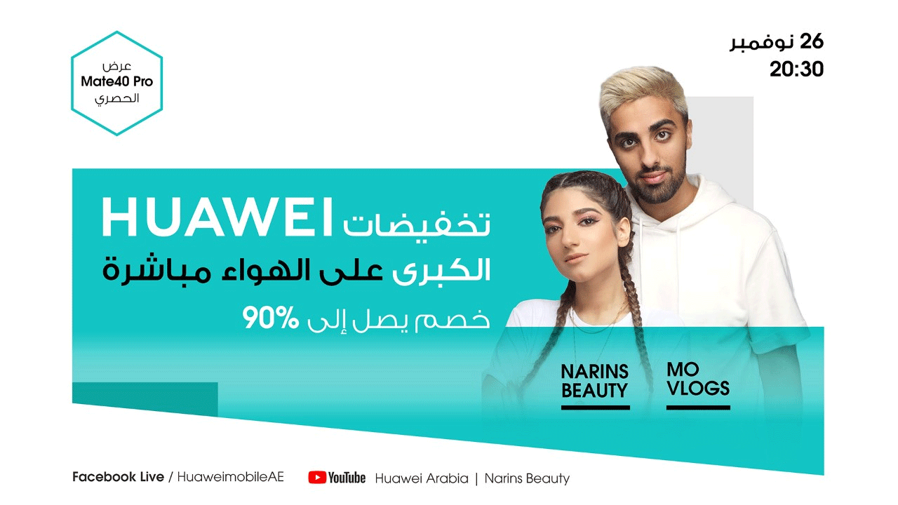 سيتم بث HUAWEI MEGA LIVE SALE باللغة العربية في 25 نوفمبر من قبل المؤثر التكنولوجي الشهير "فيكس – Fex" بينما سيشهد 26 نوفمبر النسخة الإنجليزية التي تستضيفها شخصيات الإنترنت Mo Vlogs و Narins beauty، ويبدأ الحدث في الساعة 8:30 مساءً بتوقيت الإمارات في كلا اليومين.