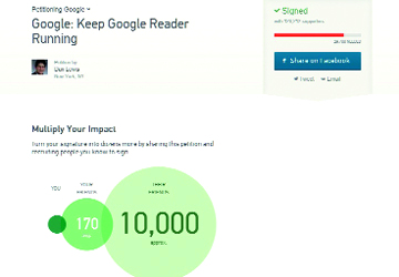 حصلت العريضة المطالبة بعدم إيقاف خدمة «غوغل ريدر» على موقع (Change.org)، حتى الساعة 00:12 ظهراً بتوقيت الإمارات، على أكثر من 120 ألف توقيع يطالب «غوغل» بإبقاء خدمة خلاصات الأخبار تعمل، وذلك من أصل 150 ألف توقيع مطلوب لإتمام العريضة.