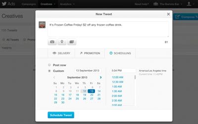 وأوضحت الشبكة الاجتماعية أن المعلنين يستطيعون إنشاء وجدولة التغريدات عبر الضغط زر التغريد الأزرق في أعلى الزاوية اليمنى من شريط الملاحة في موقع إدارة الحملات الإعلانية، واختيار ميزة جدولة التغريدات (SCHEDULING).