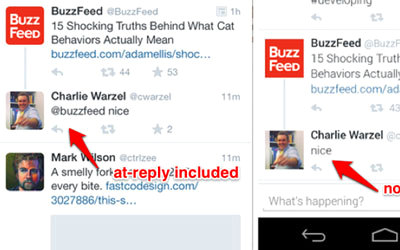 وتؤكد صور مسربة لنسخة من تطبيق «تويتر» لنظام «أندرويد» ما قالته شيلر، إذ يظهر في التطبيق أنه تم بالفعل إزالة رمز «@» في الردود، وأصبح الرد يظهر بشكل مباشر يشبه إلى حد ما التعليقات ضمن شبكة التواصل الاجتماعي «فيس بوك».