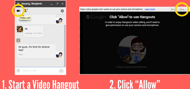 وأشارت مهندسة البرمجيات في شركة «غوغل»، فكتوريا كيرست، عبر حسابها على شبكة «غوغل بلس» بأنه سيصبح بالإمكان النقر لبدء محادثة فيديو جماعية، ومن ثم السماح لخدمة «هانغ آوتس» باستخدام الكاميرا والميكروفون، لتصبح الأمور مكتملة ويتم إجراء المحادثة.