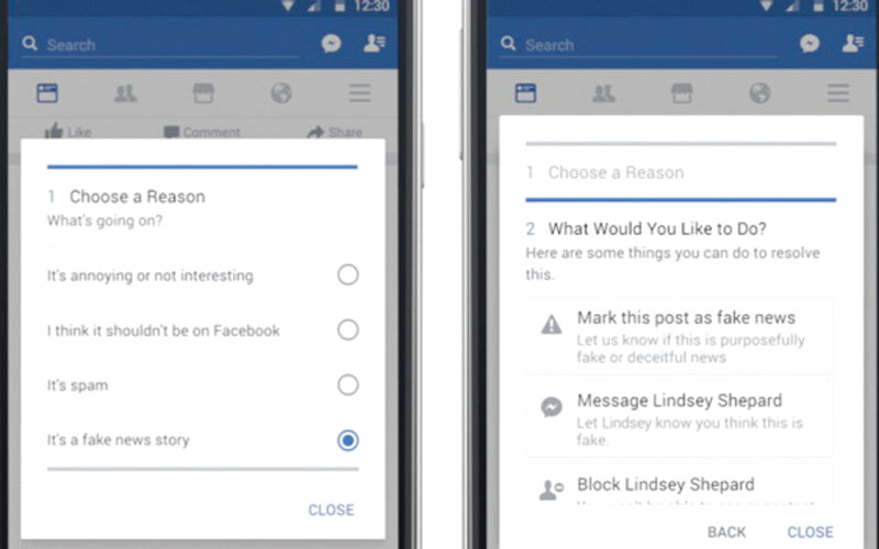 وقالت شركة «فيس بوك»: «نحن نؤمن بإعطاء الناس فرصة للتعبير عن آرائهم، ولا يمكن أن نكون حكاماً على الحقائق بأنفسنا، ولذلك نحن نتعامل مع تلك المشكلة بحرص». وأضاف موقع التواصل الاجتماعي خياراً جديداً بعنوان «إنه خبر زائف» إلى خاصية الإبلاغ، التي تستخدم حالياً لمكافحة المحتويات غير المرغوب فيها، أو أي محتويات أخرى «مزعجة».