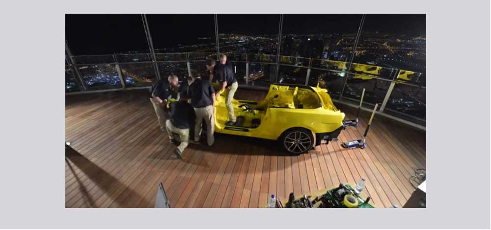 بالفيديو والصور..أعلى قمة في "برج خليفة" تشهد تجميع "فورد" لسيارتها "موستانج" خلال 7 ساعات