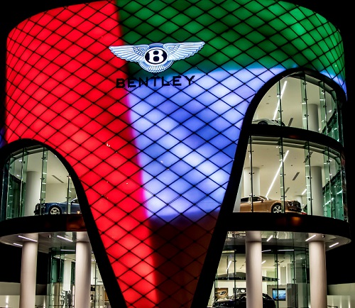 وستكون صالة عرض Bentley في الإمارات إحدى أبرز الأبنية الفارهة على شارع الشيخ زايد، وقد صُممت لتتفوق على أي صالة عرض موجودة للسيارات الفاخرة، إلى جانب أنها تضم واحدةً من أكثر الواجهات المضيئة تقدماً في العالم، حيث تتكون الواجهة من 160 ألف مصباح LED قادرة على عرض طيفٍ كامل من الألوان، بما فيها كافة الألوان القياسية في مجموعة ألوان سيارات Bentley، إلى جانب عرض صور سيارات Bentley المصنعة حسب الطلب. ويمكن للواجهة أيضاً بث فيديو عالي الدقة وعدداً غير محدود من الرسوميات والمشاهد المضيئة.