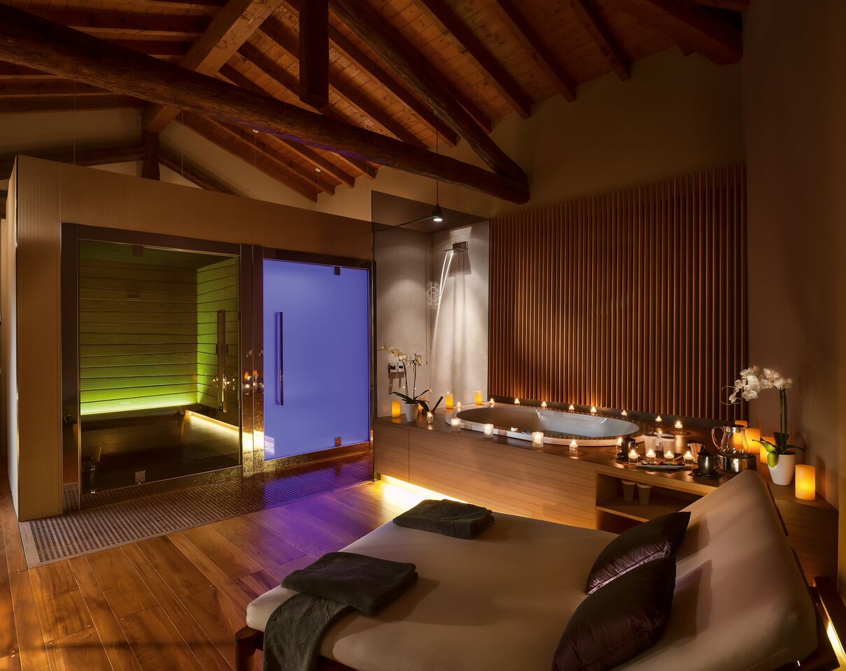 يضم T سبا حوض سباحة رائع مع إطلالة خلابة على البحيرة وخمسة أنواع مختلفة من التدليك المائي: أسرة مزودة بفقاعات الهواء، نفثات الماء والأكسجين غرست في الجزء السفلي لتدليك باطن القدمين فقط. يمكن للضيوف الاستمتاع بلمسة اضافية من العزلة في مغارة خاصة أو الاستمتاع بالجاكوزي في الهواء الطلق.