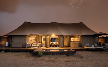 "باب النجوم-المغيرة" أول موقع للتخييم داخل محمية طبيعية في الإمارات.. فيديو على بعد 160 كم غرب العاصمة أبوظبي، يقع منتجع باب النجوم المغيرة بمدينة المرفأ في منطقة الظفرة، الذي افتتحه سمو الشيخ